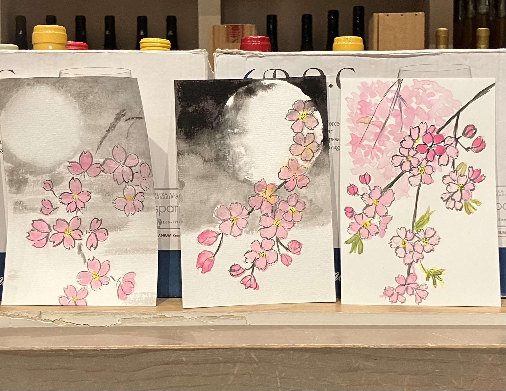 毎月美味しいワインを飲みながら、今月のお題を楽しくはがきに描く「なごみ絵」のイベントです。自然派ワインが美味しいみどりや酒店さんと月一回開催しています。 今月のお題は「夜桜」です。今日もみどりや酒店さんの美味しいスパーク…