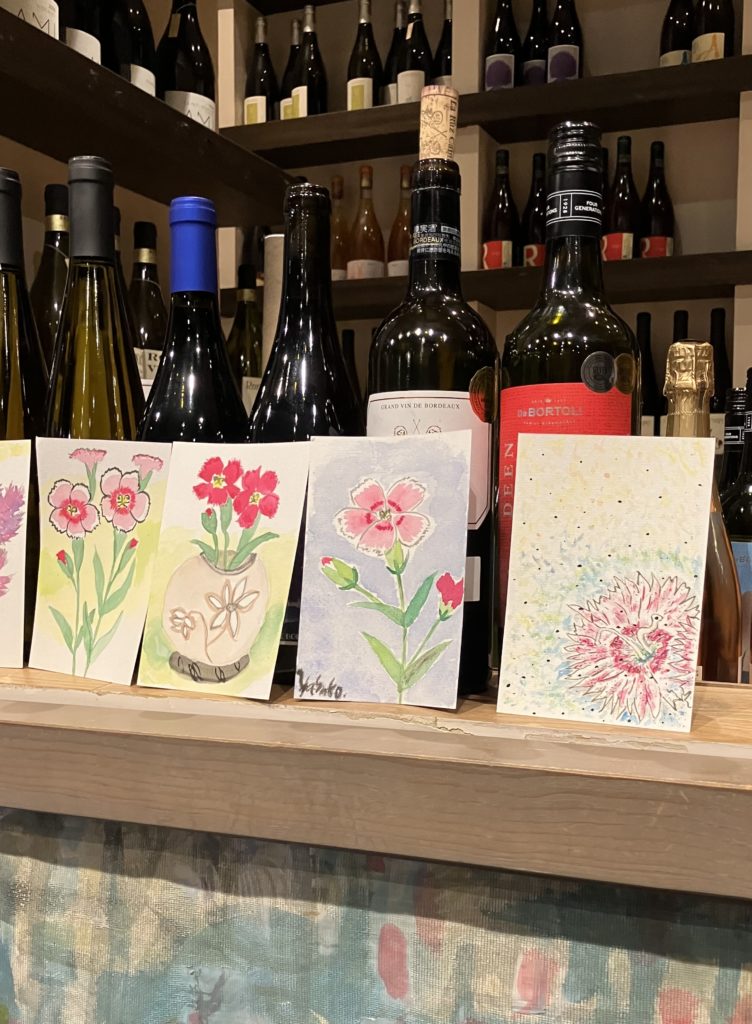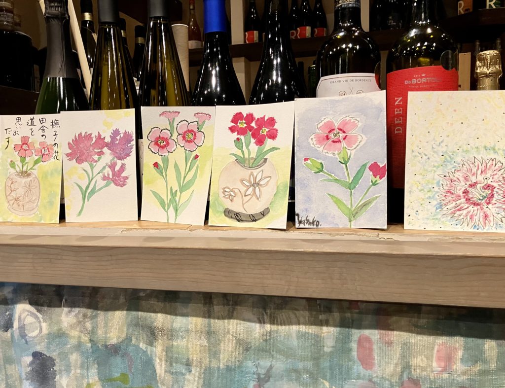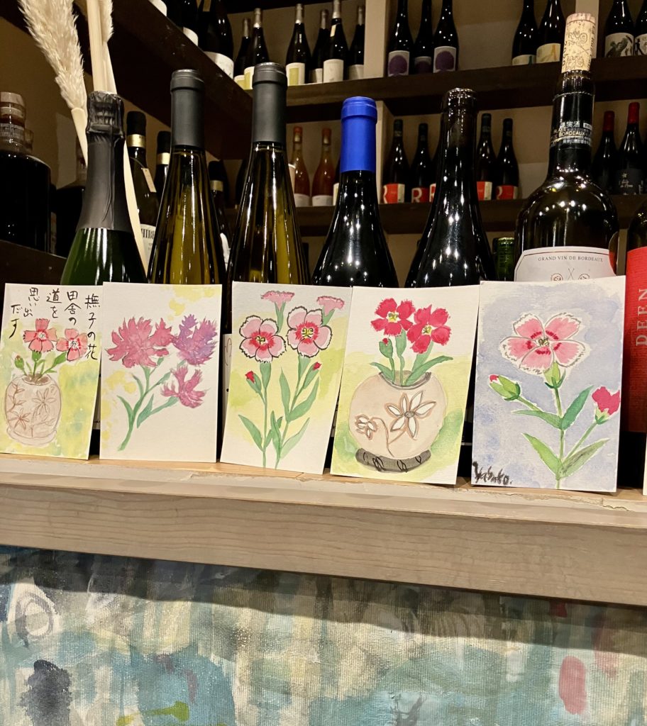 毎月美味しいワインを飲みながら、今月のお題を楽しくはがきに描く「なごみ絵」のイベントです。自然派ワインが美味しいみどりや酒店さんと月一回開催しています。今月のお題は季節の花「撫子」です。