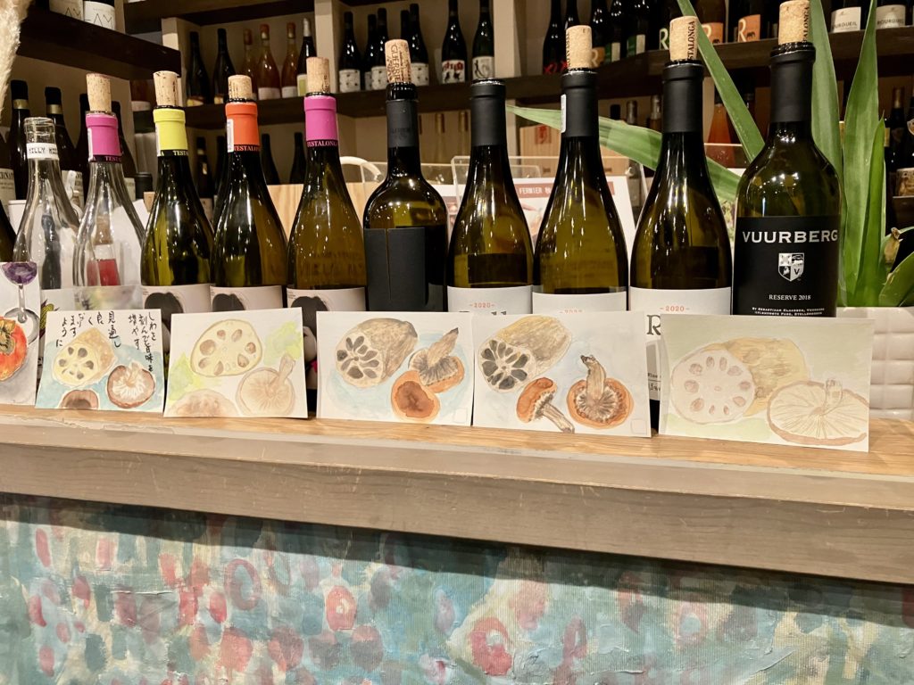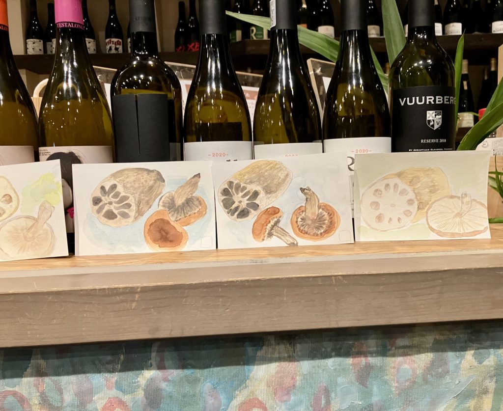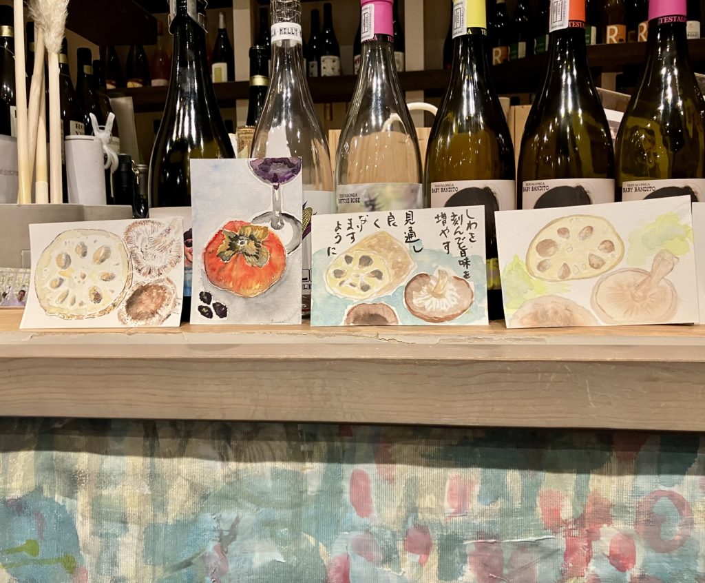 毎月美味しいワインを飲みながら、今月のお題を楽しくはがきに描く「なごみ絵」のイベントです。自然派ワインが美味しいみどりや酒店さんと月一回開催しています。