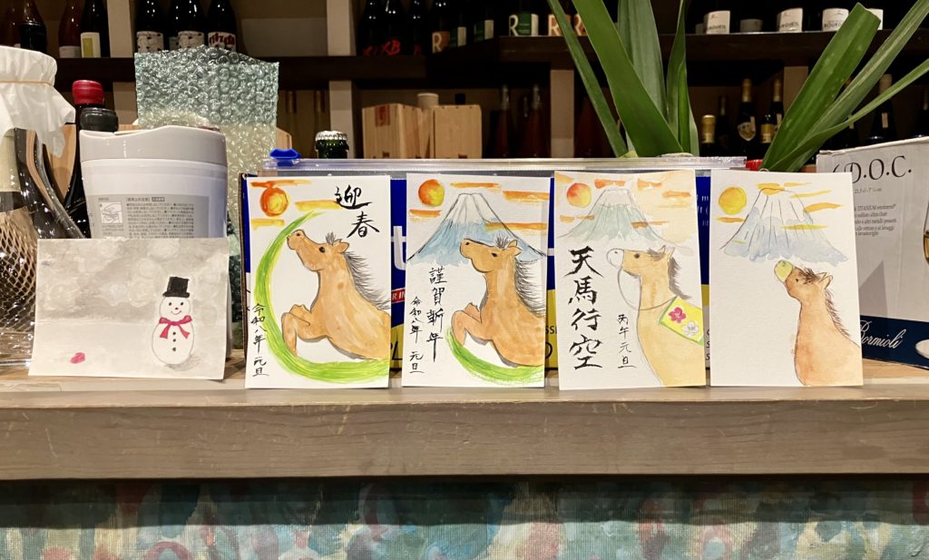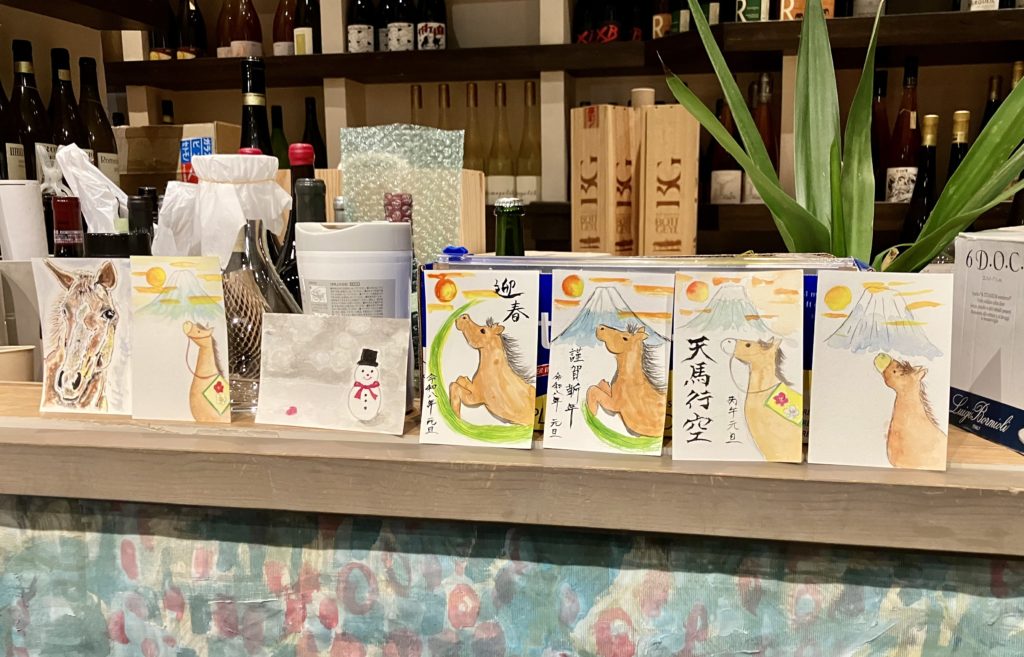 毎月美味しいワインを飲みながら、今月のお題を楽しくはがきに描く「なごみ絵」のイベントです。自然派ワインが美味しいみどりや酒店さんと月一回開催しています。